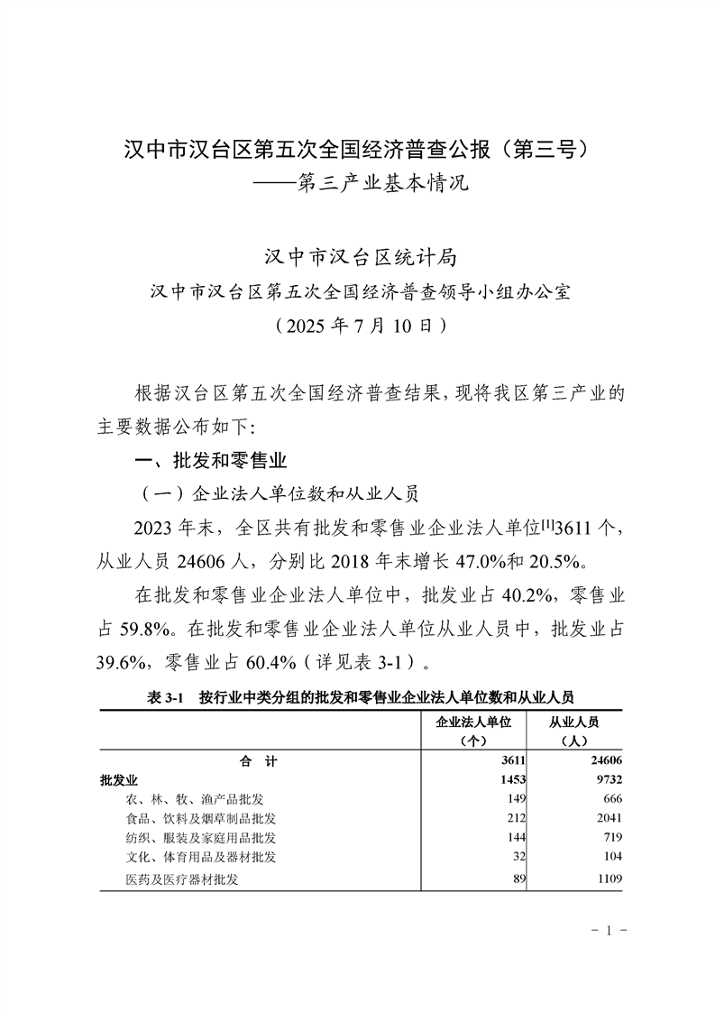 漢中市漢臺區第五次全國經濟普查公報(第三號)——第三產業基本情況