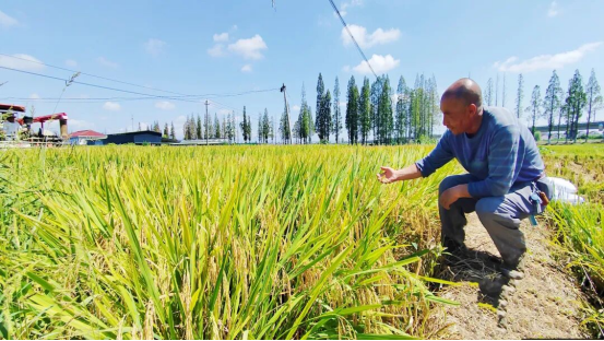 (姜壩村二組村民楊樹坤撫摸著金黃的稻穗,臉上露出久違的笑容。陳香如/攝)