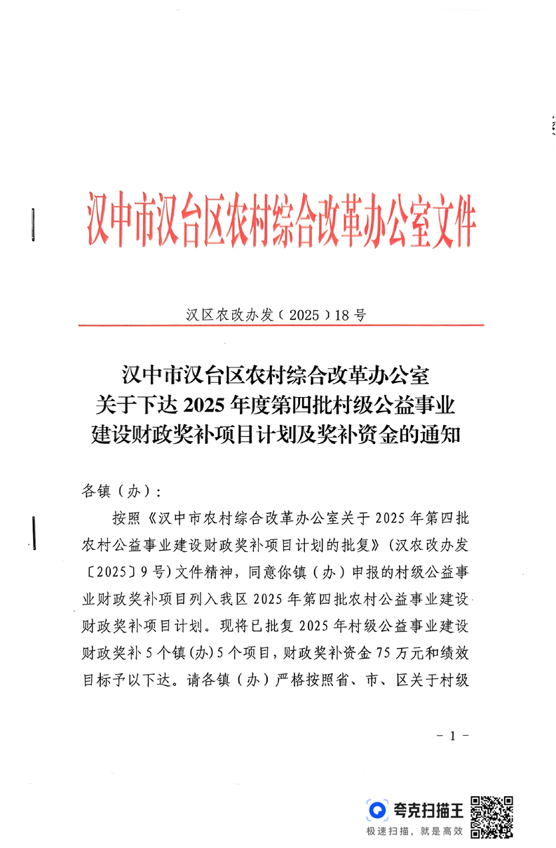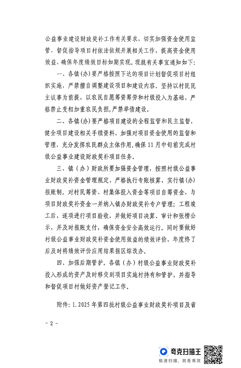 關于下達2025第四批村級公益事業建設財政獎補項目計劃及獎補資金的通知